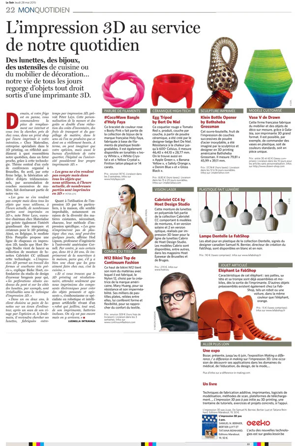 Fabriquerez-vous vos objets à la maison, dans votre imprimante perso ? Irez-vous chercher la pièce de rechange de votre frigo, après l’avoir commandée, dans un print shop, près de chez vous ? Vivrez-vous l’ère de la personnalisation à l’extrême de vos mesures corporelles mais aussi de vos goûts ? Lisez les réflexions du Boudoir numérique sur le 3D printing, interviews et shopping produits à l’appui, dans cet article du quotidien belge Le Soir, consacré à "L'impression 3D au service de notre quotidien".